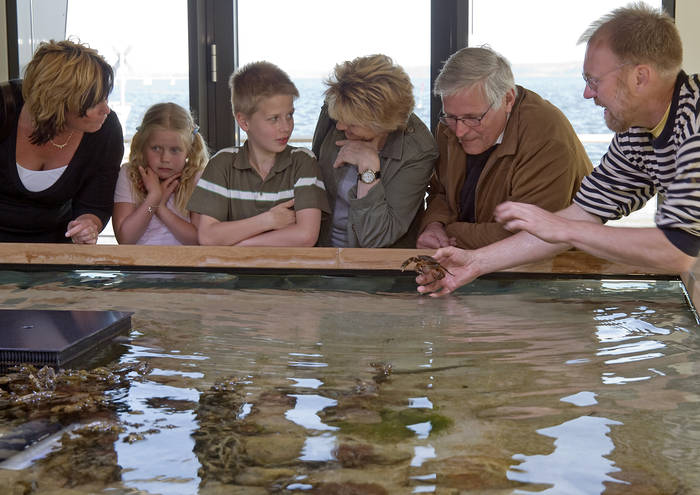 Im Zentrum des Ostsee Info-Centers steht das Fühlbecken, ein 3 x 4 Meter großes, tischhohes Aquarium. Bereits der Blick über den lebendigen Meeresgrund vermittelt einen außergewöhnlichen Eindruck. Und dann dürfen die Gäste den Plattfischen über die Haut streichen, die Strandkrabben fassen und spüren, wie sich die Seesterne auf ihrer Hand festsaugen. Diese hautnahe Begegnung mit den Meeresbewohnern wird unvergesslich bleiben!