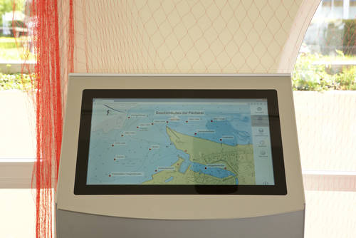 Zweifellos bilden die multimedialen Infoterminals die Höhepunkte der Ausstellung im Innenraum. Auf ihnen kann sich der Besucher durch über 90 Jahre Niendorfer Hafen- und Fischereigeschichte bewegen und nicht zuletzt viel über Menschen wie Heinzl Ficht erfahren, die über Jahrzehnte den Hafen prägten. Per Zeigefinger und via Karte, Luftbild oder Zeitstrahl geht es durch die Bilder, Filme und Texte. Wer mehr erfahren möchte, kann dies über zahlreiche Vertiefungsseiten tun. Eine 13-köpfige Arbeitsgruppe aus lokalen Fischern und ehrenamtlichen Akteuren hatte über Monate hunderte Fotos gesammelt, gefiltert und mit Informationstexten versehen. Ein Kieler Unternehmen hat das umfangreiche Material für drei Touchscreenterminals aufbereitet und installiert.