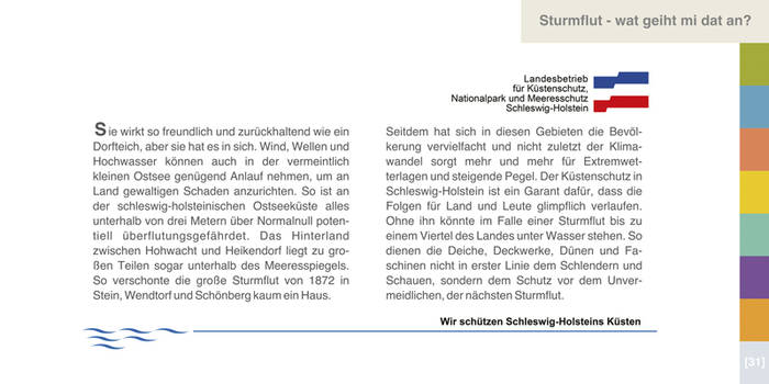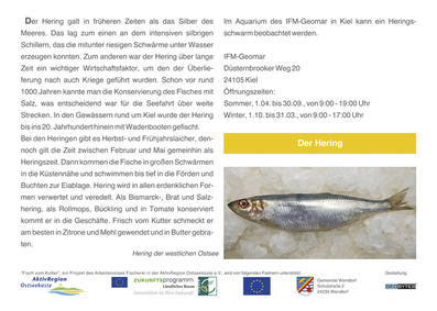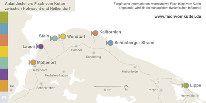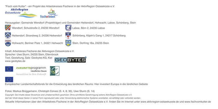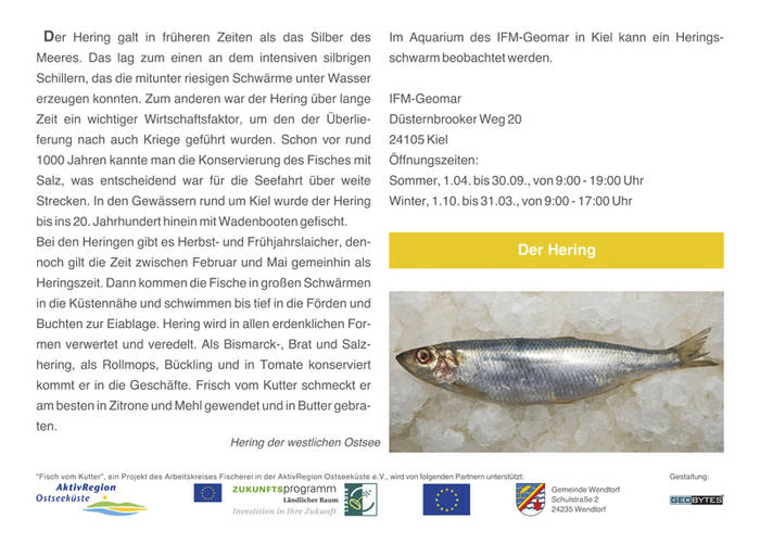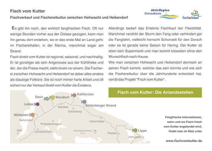 Allerdings bedarf das Erlebnis Fischkauf der Flexibilität. Manchmal verdirbt der Sturm den Fang oder verhindert gar die Fangfahrt, vielleicht herrscht Schonzeit für den Dorsch oder es ist gerade keine Saison für Hering. Der Kutter ist eben kein Supermarkt und man kommt bisweilen ohne den Wunschfisch nach Hause. Wie man zum Beispiel zwischen Hohwacht und Heikendorf dennoch an seinen Fisch kommt, welcher das sein könnte und wie sich die Fischereikultur über die Jahrhunderte entwickelt hat, verrät die Broschüre "Fisch vom Kutter".