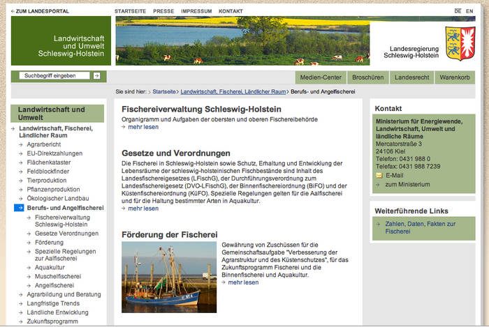 Auf den Seiten des Ministeriums finden Sie jedoch nicht nur Gesetze und Verordnungen sondern auch interessante Inhalte zu Aquakulturen, zur Muschel- und Aalfischerei sowie zu den umfassenden Förderungsmöglichkeiten in der Fischerei und ihren Nachbardisziplinen.