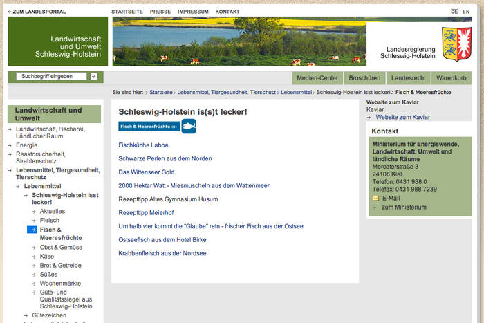 Fisch und Meeresfrüchte in allen Facetten stellen natürlich die wichtigste Ressource für lokale und regionale Delikatessen. Auf den Seiten des Ministeriums erhalten Sie alle Informationen zu „Schleswig-Holstein is(s)t lecker!“ und vieles darüber hinaus.,Guten Appetit.